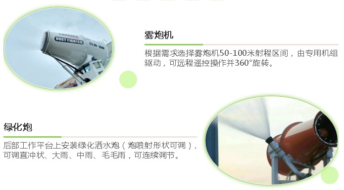 工作效率高、噴霧速度快;對容易引起塵埃的堆場噴水除塵時,噴出的霧粒細小、與飄起的塵埃接觸時,形成一種潮濕霧狀體,能快速將塵埃抑制降沉,霧量沉降率可達95%。