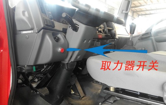 第三步:掛上取力器。取力器開關分油剎和汽剎,(注意在掛取力器的時候先踩下離合打開開關,慢慢松離合)具體如下圖: