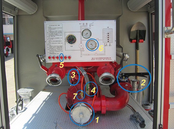 第五步:水加滿后,摘掉取力器,關閉進水閥圖中3的位置,打開消防泵排污閥圖中7的位置排真空,拆下吸水管,蓋好蓋子。